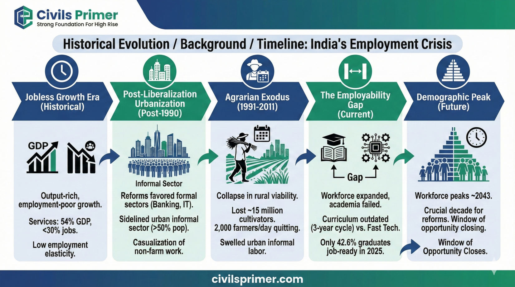 - Jobless Growth (1991-2015): While GDP grew at 7-8%, employment elasticity was close to zero. Capital-intensive growth (machinery replacing men) meant higher output did not equal higher employment.