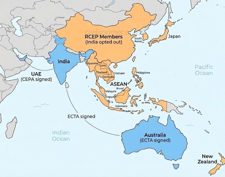- RCEP (Regional Comprehensive Economic Partnership): A massive group of Asian nations. India opted out in 2019 to protect its dairy and manufacturing sectors from cheap Chinese and New Zealand imports.